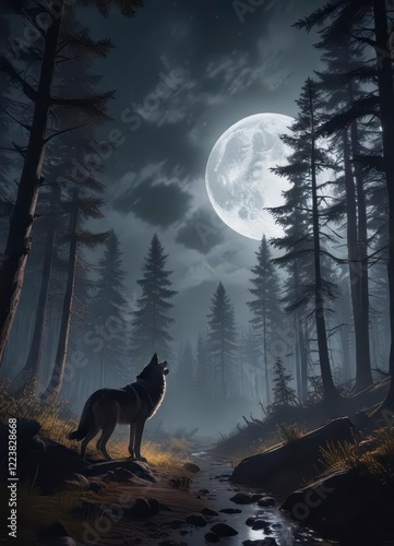 Moonlit forest with a howling wolf in the distance, trees, full moon, forest