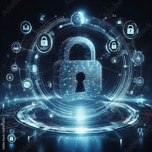 More abstract cyber security network technology with a lock icon, Generative Ai