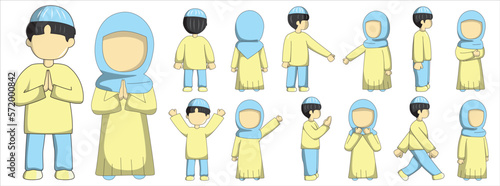 Moslem boy and girl character with blue and yellow pastel outfit. Moslem couple cartoon character. Suitable for ramadhan graphic design element and sticker pack