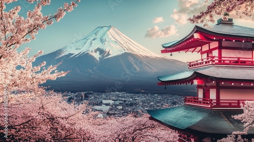 Mount Fuji in Japan with cherry blossoms in the foreground.