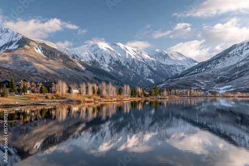 Mountain lake reflecting snow-capped peaks