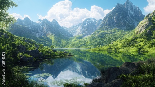 Mountain lake serene reflection, scenic valley landscape