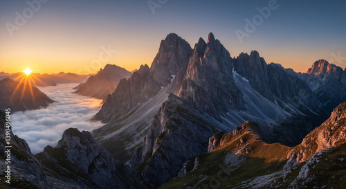 Mountain Peaks in Sunset Light with Clouds