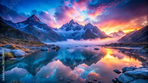 Mountain Peaks Reflected in Lake at Sunset