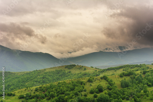 Mountain spring landscape with a small meadow in the valley.