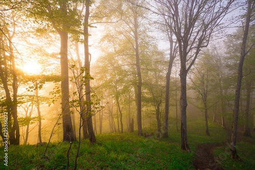 Mountain summer. Fairy misty forest, sunset