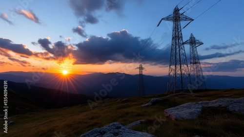 Mountain sunset with power lines