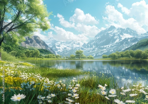 Mountains, lake and flowers