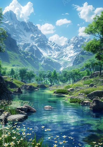 Mountains, river and flowers