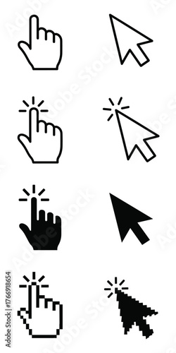 Mouse Cursor Icons Set: Arrow, Hand Pointer, Click Action, and Pixelated Selection