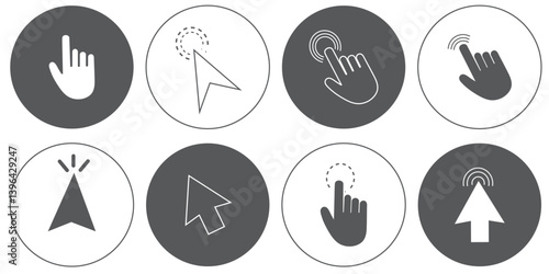 Mouse Cursors and Pointers, linear style icon set. On-screen navigation and user interactions. Cursor designs arrows, hands. Clicking, selecting, dragging actions. Hand and mouse click icon.