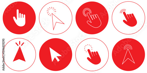 Mouse Cursors and Pointers, linear style icon set. On-screen navigation and user interactions. Cursor designs arrows, hands. Clicking, selecting, dragging actions. Hand and mouse click icon.