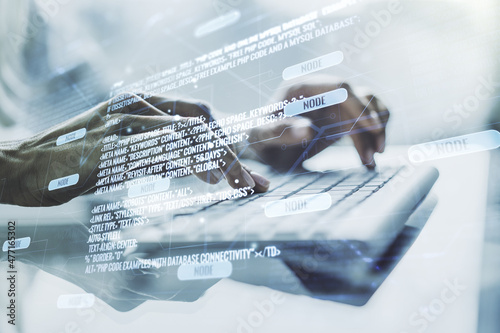 Multi exposure of abstract creative coding sketch and hands typing on computer keyboard on background, artificial intelligence and neural networks concept