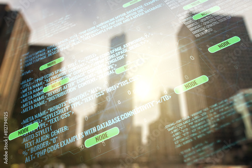 Multi exposure of abstract graphic coding sketch on modern architecture background, big data and networking concept