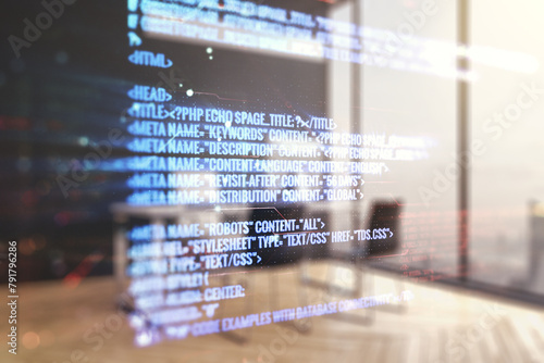 Multi exposure of abstract programming language hologram and modern desk with computer on background, artificial intelligence and machine learning concept