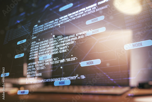 Multi exposure of abstract programming language hologram on computer background, artificial intelligence and neural networks concept