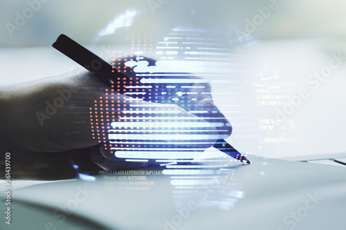 Multi exposure of abstract programming language hologram with world map and man hand writing in notepad on background, artificial intelligence and neural networks concept