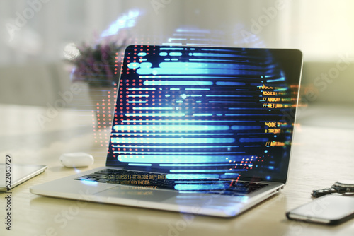 Multi exposure of abstract programming language hologram with world map on computer background, artificial intelligence and neural networks concept