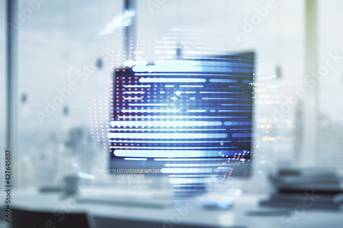 Multi exposure of abstract software development hologram with world map on laptop background, global research and analytics concept
