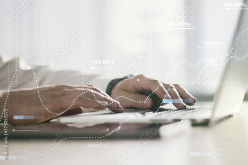 Multi exposure of abstract statistics data hologram interface with hands typing on computer keyboard on background, computing and analytics concept