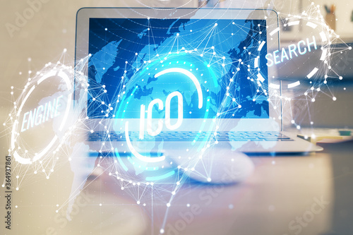 Multi exposure of blockchain theme hologram and table with computer background. Concept of bitcoin crypto currency.