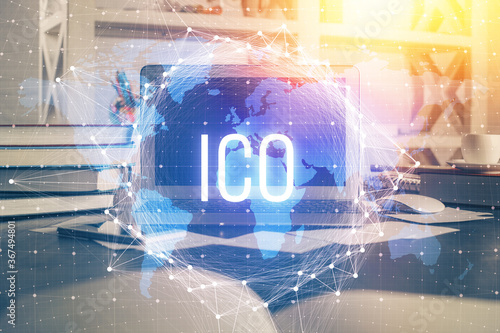 Multi exposure of blockchain theme hologram and table with computer background. Concept of bitcoin crypto currency.