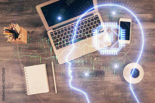 Multi exposure of brain sketch hologram over topview work table background with computer. Concept of big data.