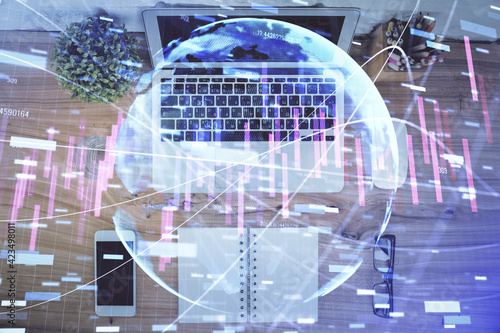 Multi exposure of financial chart drawing over table background with computer. Concept of research. Top view.