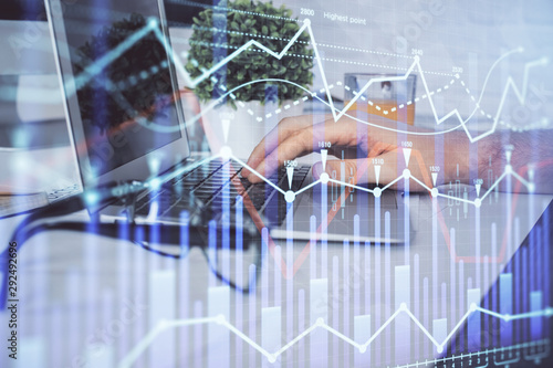 Multi exposure of graph with man typing on computer in office on background. Concept of hard work. Closeup.