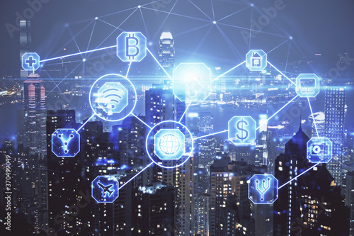 Multi exposure of social network theme drawing and cityscape background. Concept of people connecton.