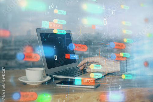 Multi exposure of technology hologram with man working on computer background. Concept of big data.