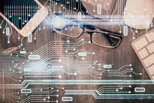Multi exposure of technology theme drawing over work table desktop. Top view. Global data analysis concept.