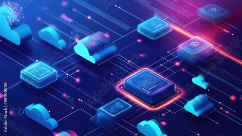 Multi-cloud data architecture with 2D and 3D clouds, visualizing digital data connectivity and cloud services in vector format