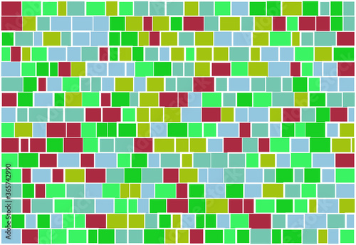 Multicolor brick wall from nested rectangles vector background with six different colors, mosaic pattern with random white borders, useful for backgrounds, wallpapers and wrapping papers