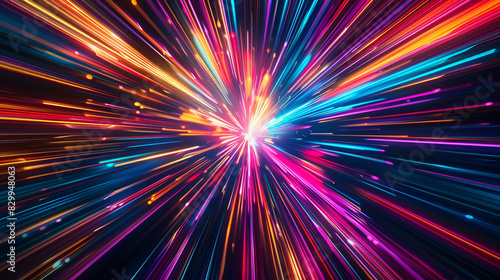 Multicolored beams of light, radial pattern, dark background