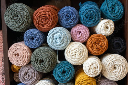 Multicolored cotton balls of yarn and ropes for macrame close up