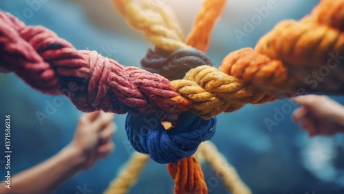 Multicolored hands holding intertwining rope symbolize unity and togetherness against outdoor backdrop of blue sky and greenery.