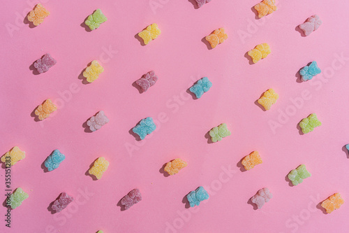 multi-colored jelly bears on a pink background