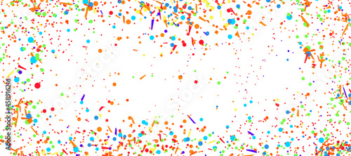 Multicolored pattern with random falling colored confetti on white background. Texture with many glitters for design. Greeting cards. Explosion. Bright firework. Print for polygraphy