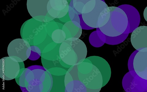 Multicolored translucent circles on a dark background. Green tones. 3D illustration