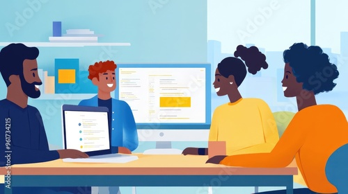 Multicultural team using cloud-based software, flat design, side view, tech startup theme, animation, vivid