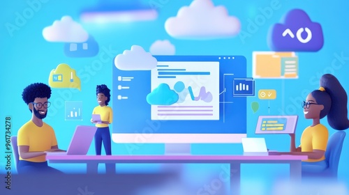 Multicultural team using cloud-based software, flat design, side view, tech startup theme, animation, vivid