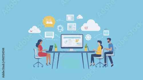 Multicultural team using cloud-based software, flat design, side view, tech startup theme, animation, vivid
