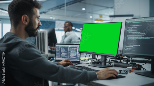 Multi-Ethnic Office: White IT Programmer Working on Computer with Green Screen Chroma Key Display. Male Software Engineer Developing App, Program, Video Game. Terminal with Code Language.