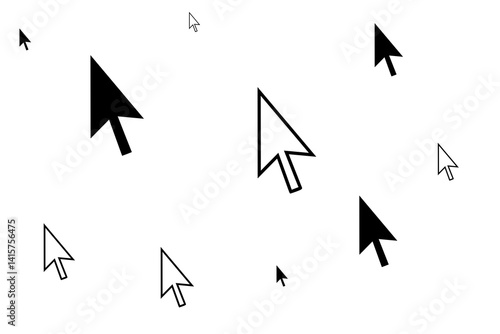 Multiple black cursor arrows scattered across a white background, representing digital navigation and user interaction in technology