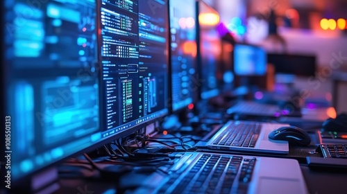 Multiple computer screens displaying data and code.