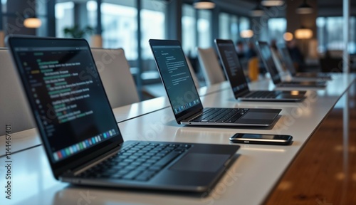 Multiple laptops on a sleek workspace in an office environment during daylight hours
