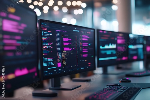 Multiple monitors displaying programming code and data analytics in a modern office setting.