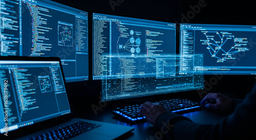 Multiple screens display lines of code and data visualizations, depicting a programmer's workspace, showcasing the intense focus and complexity of software development