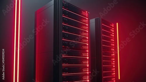 Multiple server towers with illuminated data pathways, representing cloud computing, network connectivity, and digital data management